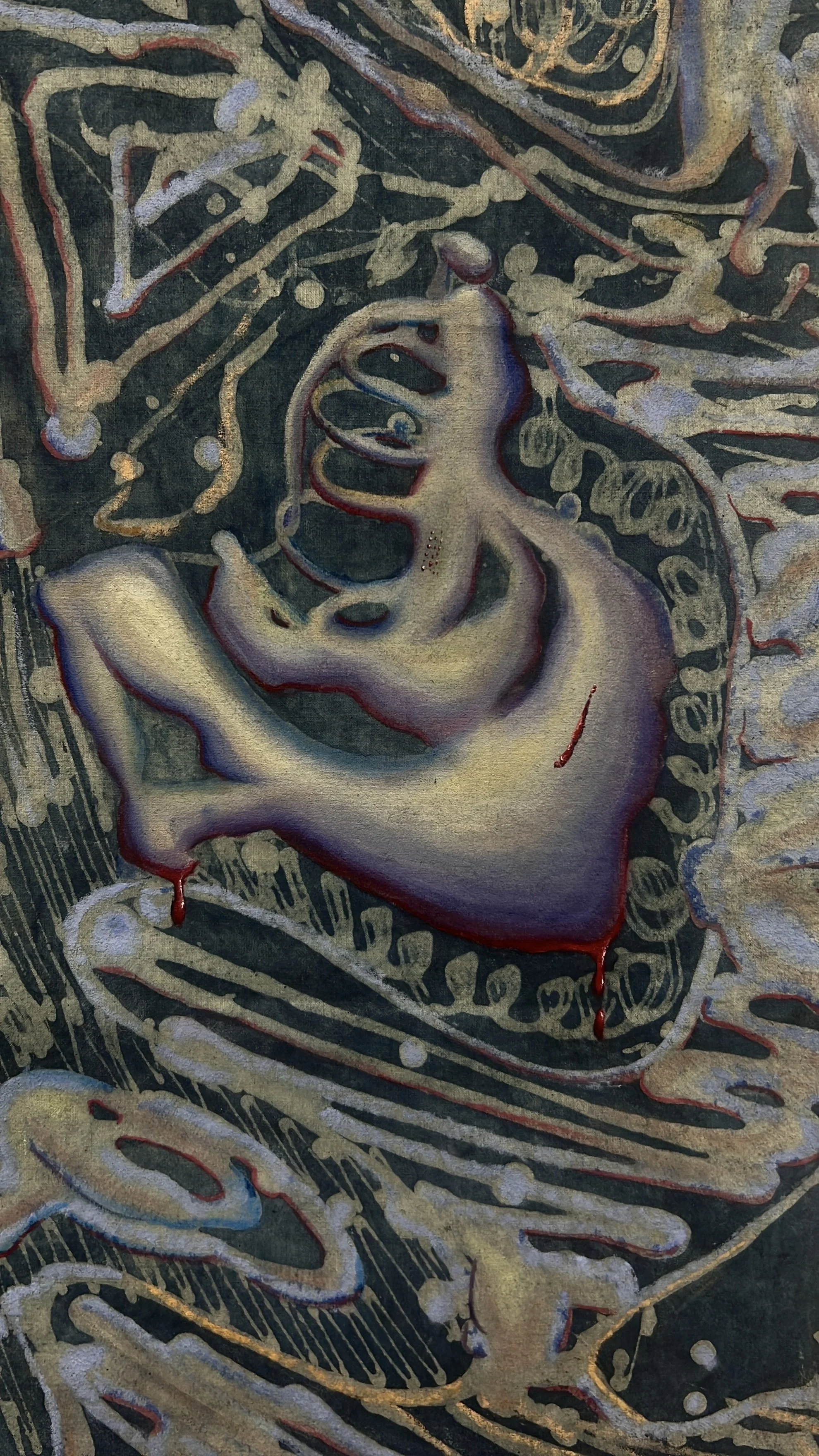 Oil, oil pastel, soft pastel and thread on batik fabric, canvas and branch.
